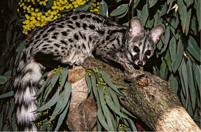 These are closely related to civets, but often mistakenly referred to as cats because of various superficial similarities in appearance. They are slender cat-like animals with a long body, a long ringed tail, large ears, a pointed muzzle and partly retractile claws. Their fur is spotted, but melanistic genets have also been recorded.
