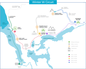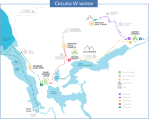 The “W” in Winter itineraries give trekkers the opportunity to marvel at the imposing granite towers that give the park its name, as well as the “horns” of Los Cuernos, the stunning aqua-blue waters of Nordenskjöld Lake, the lofty lookouts above French Valley, and magnificent Grey Glacier — the southernmost tip of Patagonia’s massive Southern Ice Field.