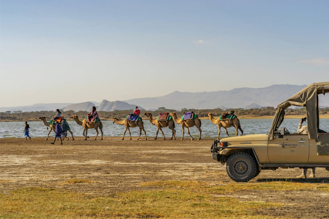 The Atua Enkop camp offers a wide variety of ways to discover the lake and its surroundings including day and night game drives in 4×4 safari vehicles, guided bush walks, or riding bikes, horses or even camels through the fabulous Rift Valley landscapes.