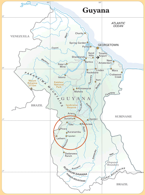 Reaching Yupukari village in the Guyana interior requires a flight from Georgetown to Lethem in the Amazon Basin and then a 4×4 journey of several hours across the Rupununi Savannah, the last part along a remote road that isn’t even marked on a map.