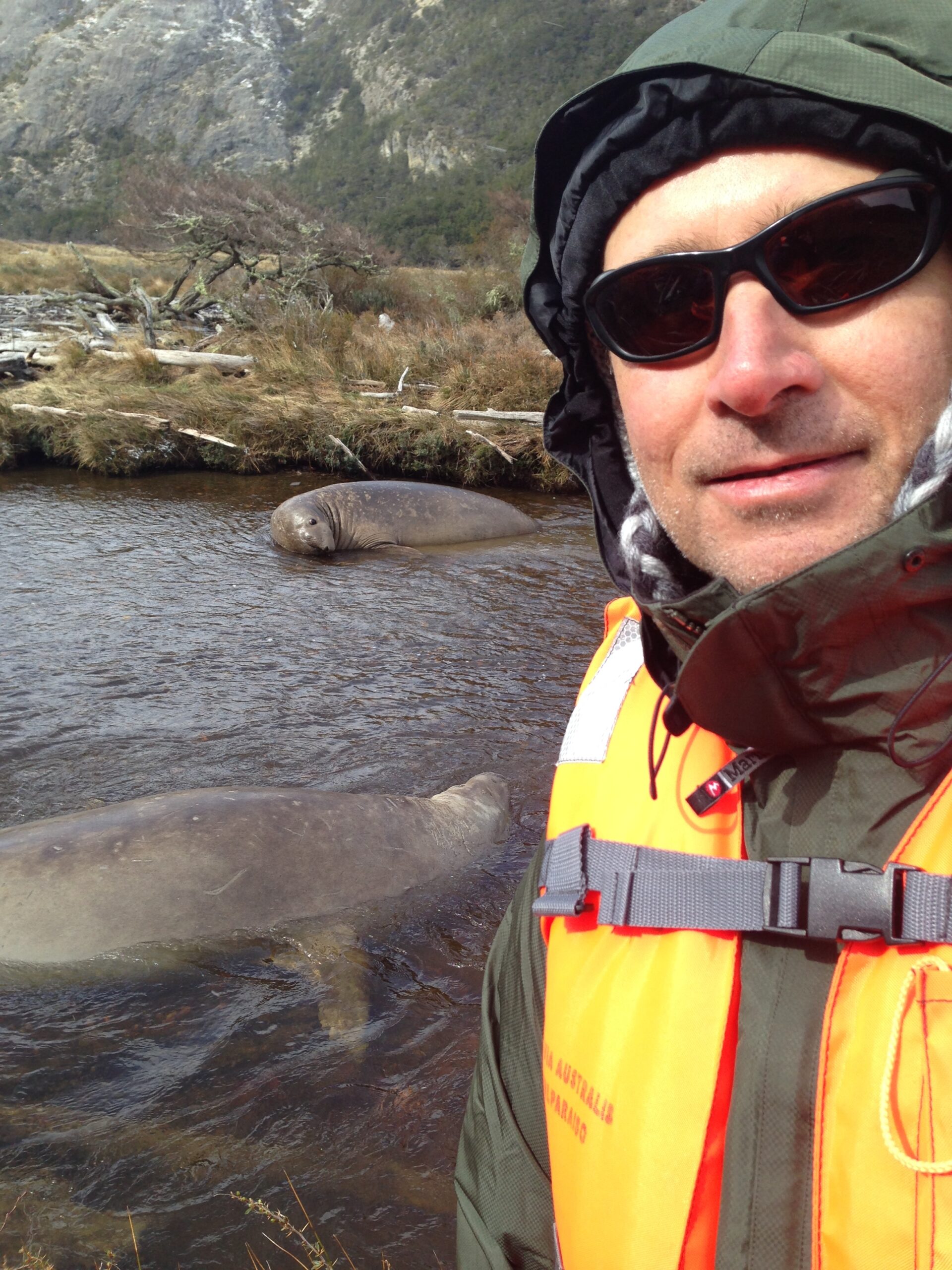 Chris Behrend with Elepant Seals in fresh water.