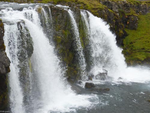 P1070146My new German friend had rented a car and invited me to drive about 50 kilometers to photograph the iconic Kirkjufell mountain peak and Kirkjufellsfoss waterfall just outside the town of Grundarfjordur. The further west we drove, the windier it became and the harder it rained. Our photographic efforts were largely thwarted as the peak was covered in fog. It was still lovely to see the lava fields, green mountains, feeding sheep on the roadside and blue-green sea with white-capped waves in the bay at Gurndafjordur.P1070150