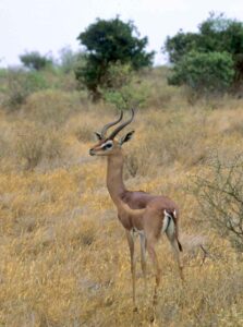 One of Africa’s most distinctive antelope, the gerenuk is renowned for its elongated neck and habit of standing on its hind legs to munch leaves off trees. No surprise that it’s also called the giraffe gazelle.