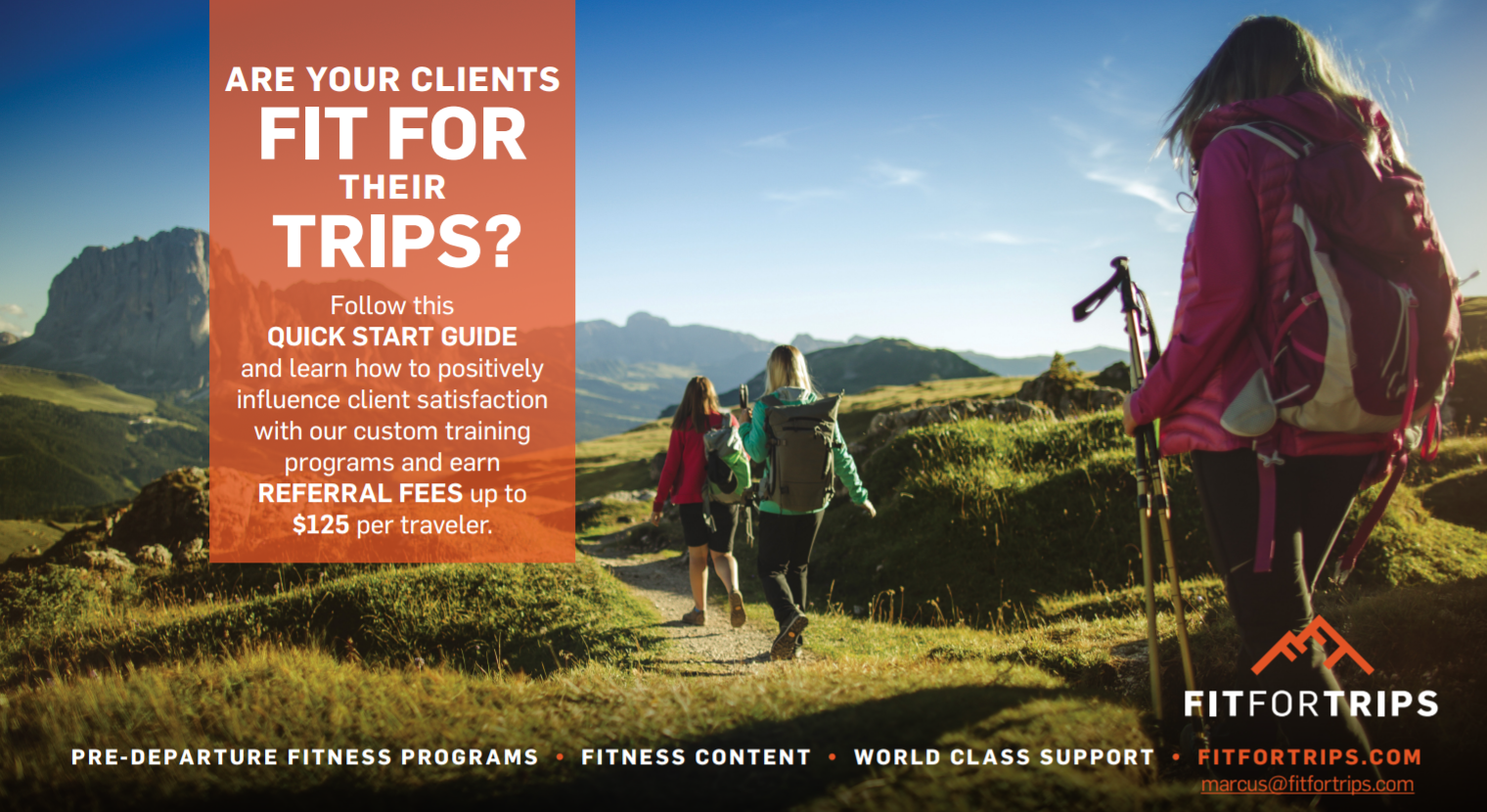 ARE YOUR CLIENTS FIT FOR THEIR TRIPS? Follow this QUICK START GUIDE and learn how to positively influence client satisfaction with our custom training programs and earn REFERRAL FEES up to $125 per traveler.